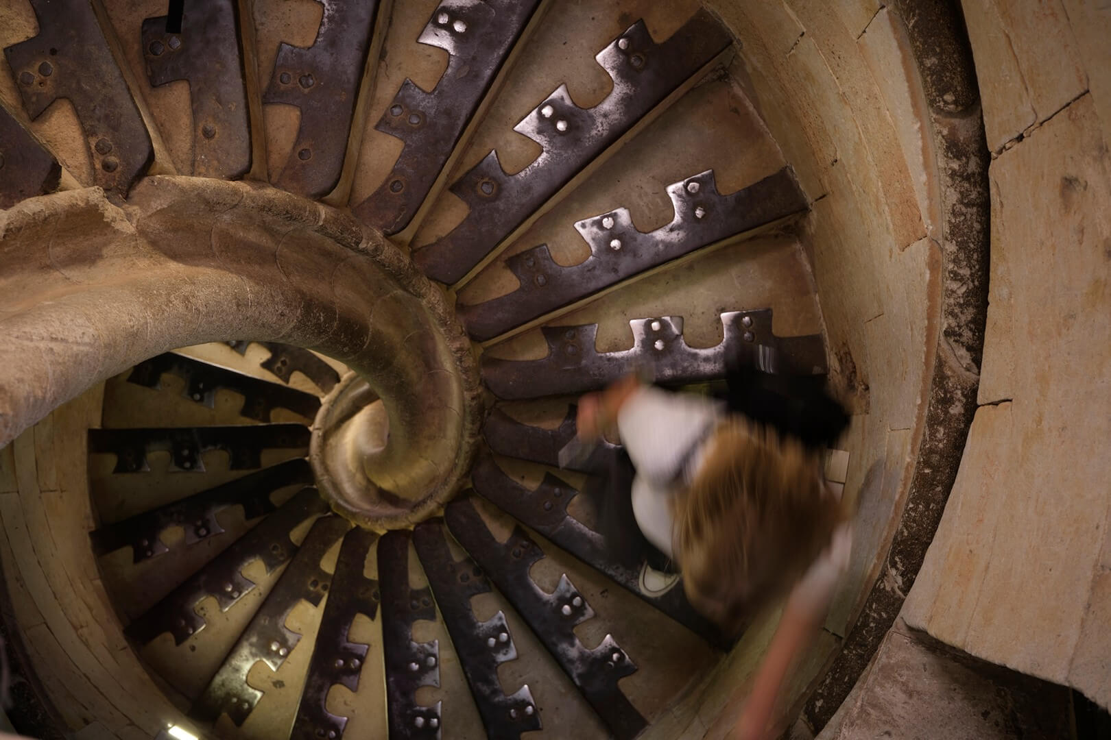 Escalera que nos conduce hasta la terraza donde podemos observar elementos arquitectónicos de cerca, además de una espléndida vista de la ciudad.