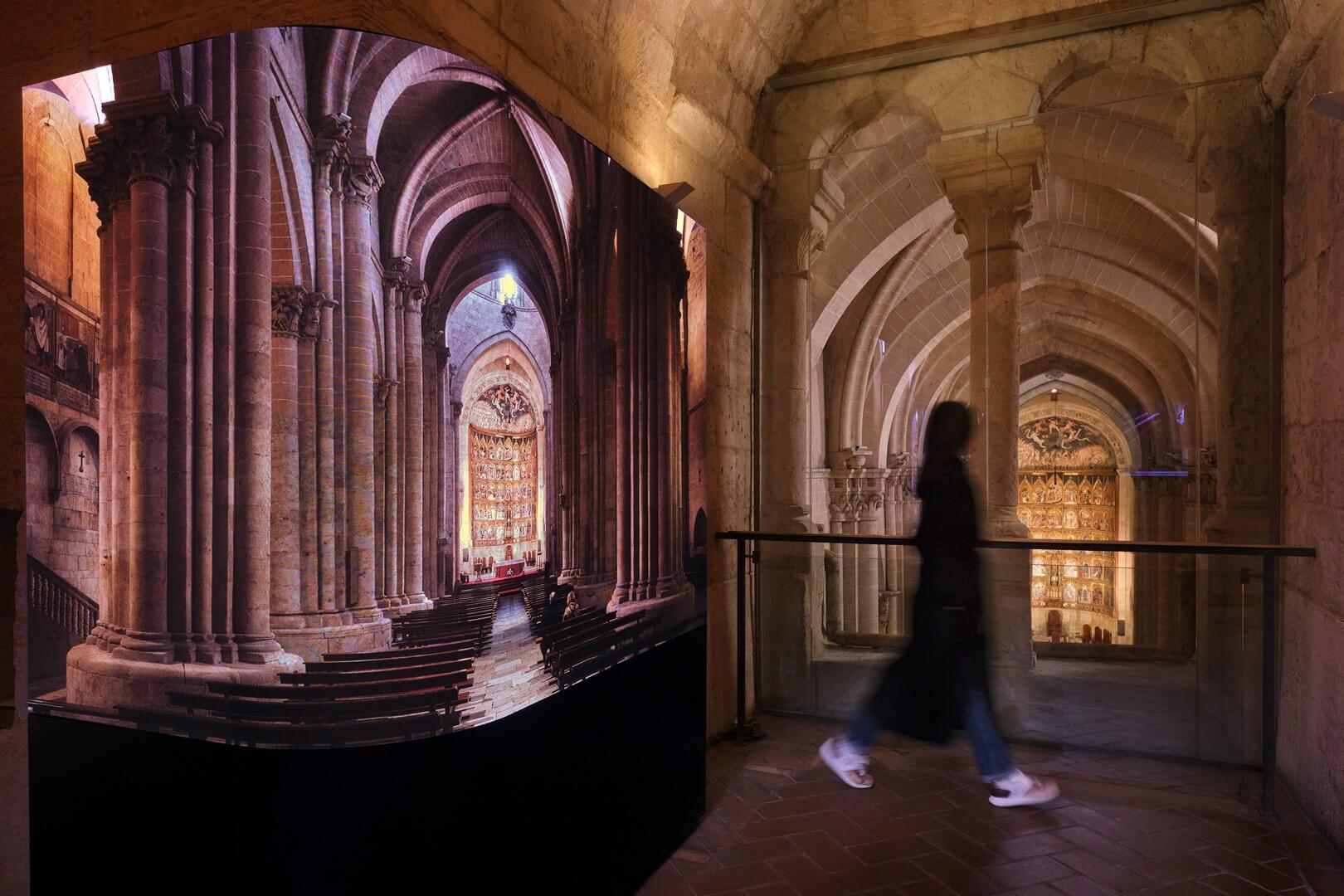 En la vista al interior destaca el retablo de la Catedral Vieja, una pieza única en Europa en la que se funde el arte gótico y el humanismo del renacimiento italiano. Sus 53 paneles muestran escenas bíblicas sobre la vida de Jesucristo y de la Virgen María. Está firmado por los hermanos italianos Delli. Además desde este lugar se puede contemplar el interior de las naves, las pinturas murales situadas sobre el retablo, que representan escenas del Juicio Final y los órganos realejos.